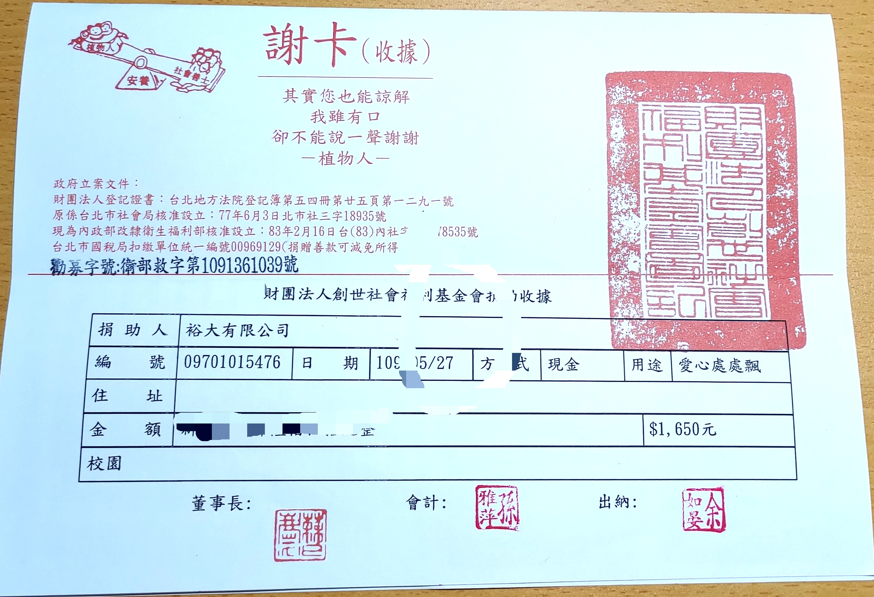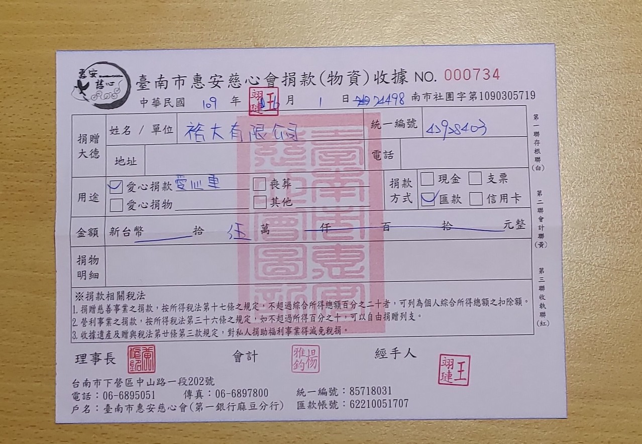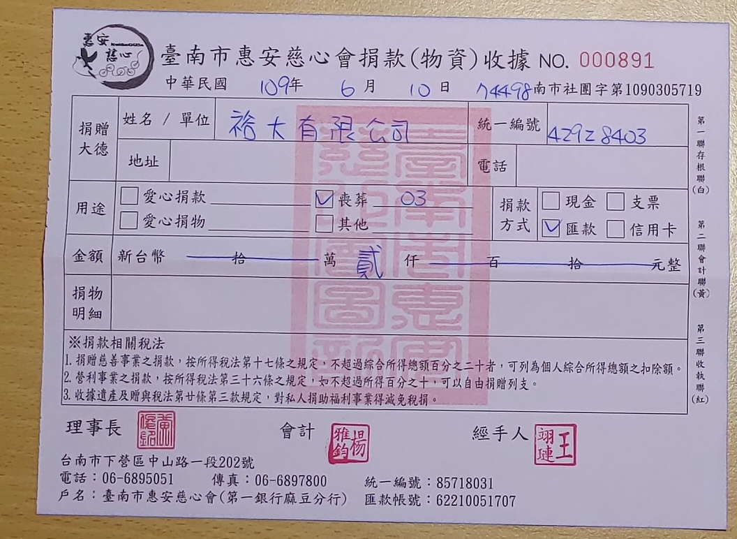 裕大公司捐贈愛心 - 臺南市惠安慈心會喪助03案